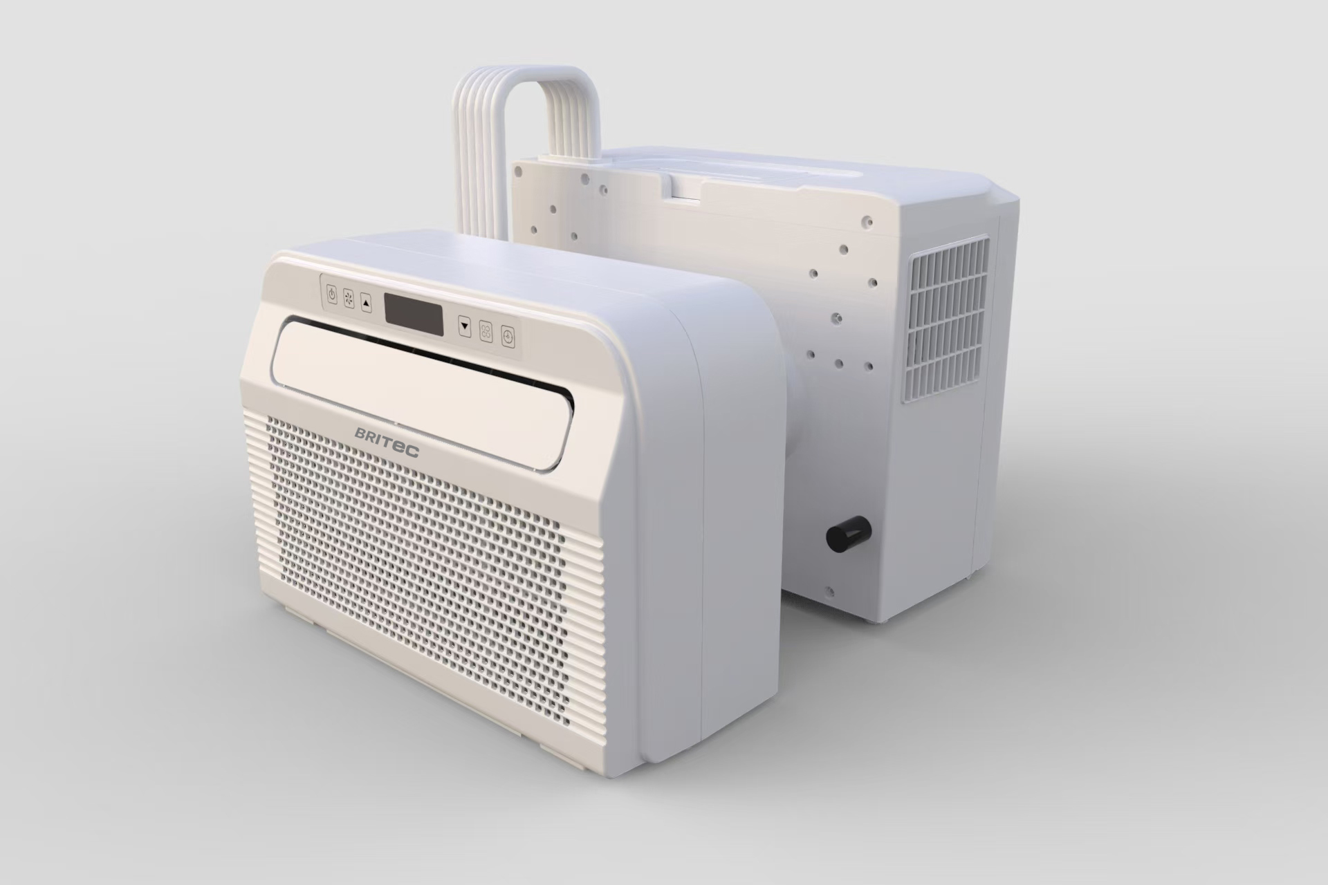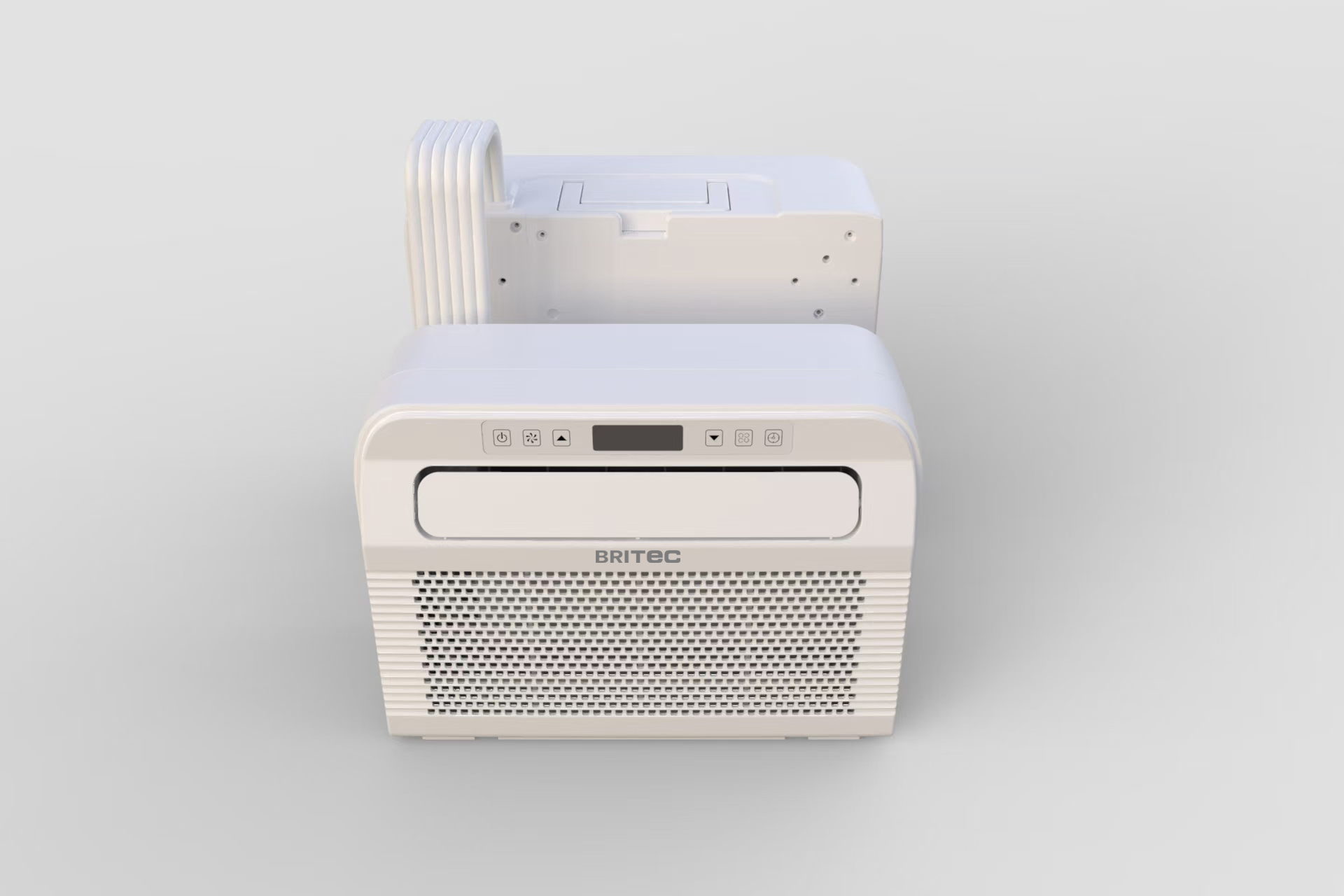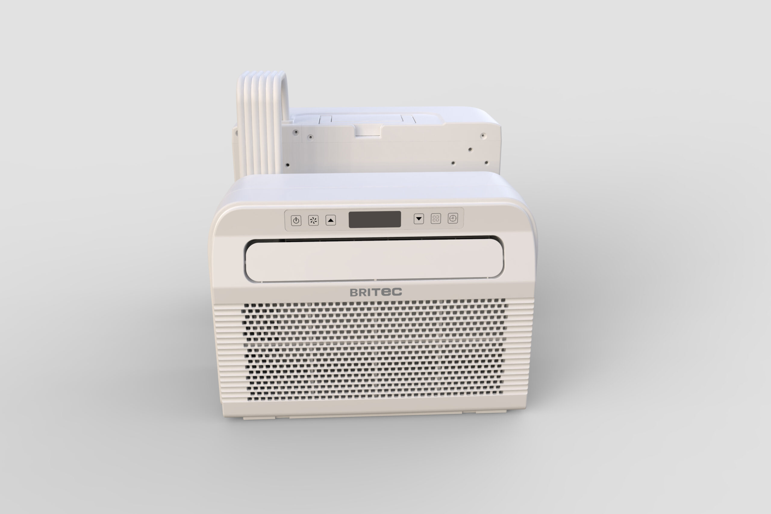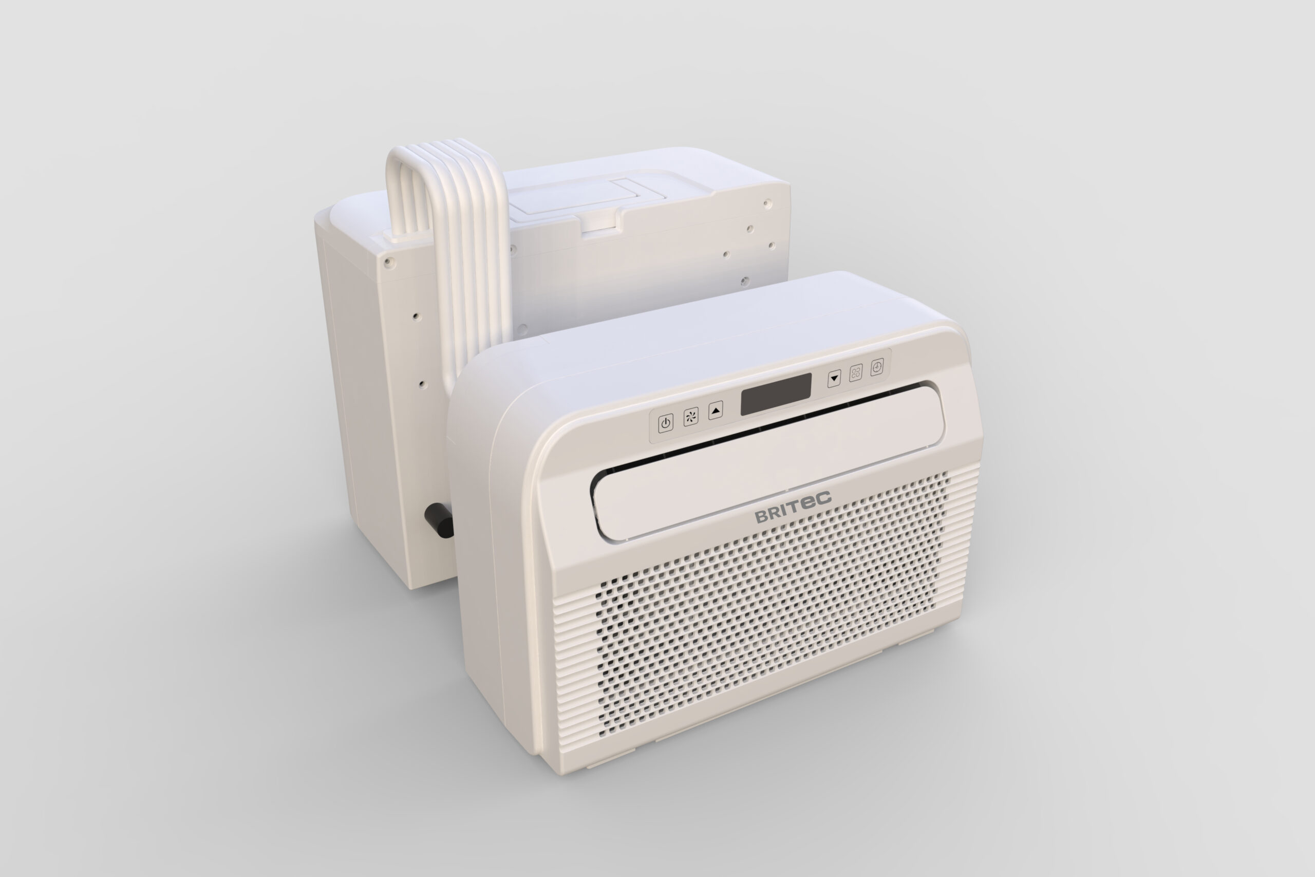 Aire acondicionado portátil BRITEC HORIZON tipo split para instalación en ventana con unidad exterior integrada que reduce el ruido interior, ideal para caravanas, campers, autocaravanas y viviendas con cobertura de hasta 40 m2.